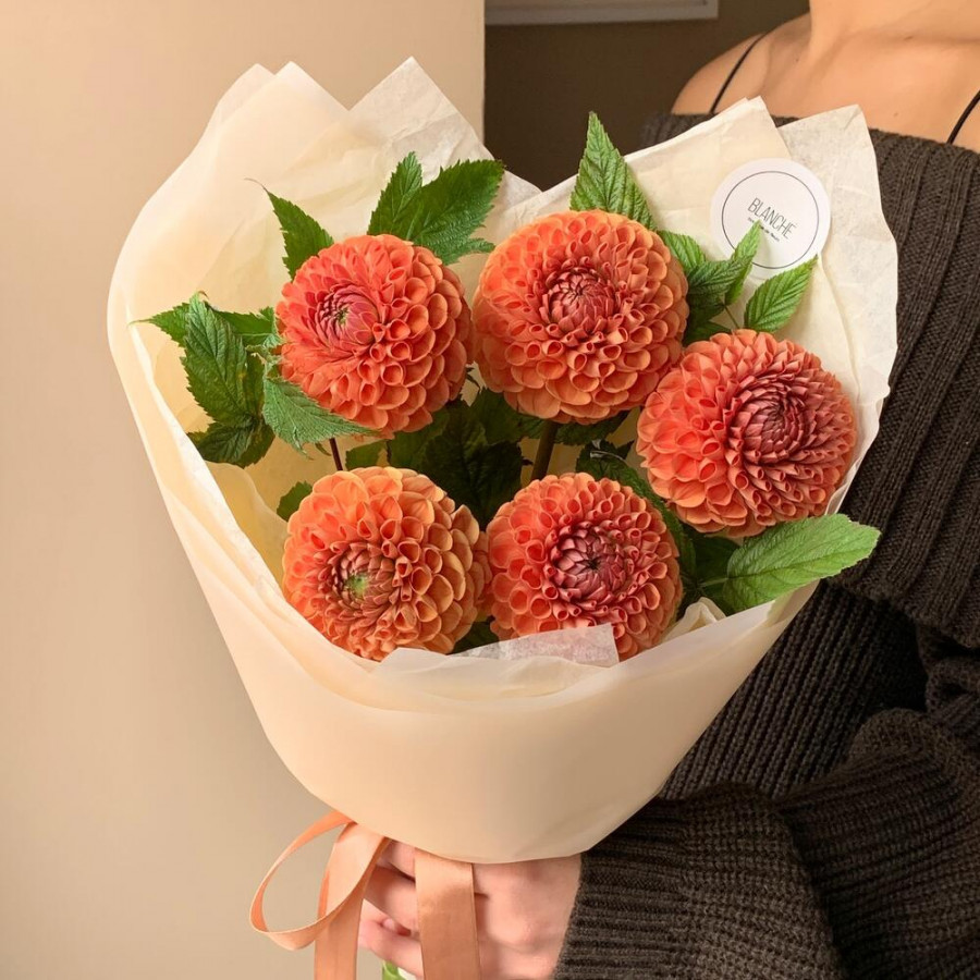 На фото букет из 5 оранжевых георгин. В составе: георгина 5 шт, зелень 2 шт, дизайнерская упаковка 1 шт, атласная лента 1 шт, . Все цветы свежие и ароматные, букет красиво оформлен и отлично подходит для подарка. Доступна доставка цветов или самовывоз.
