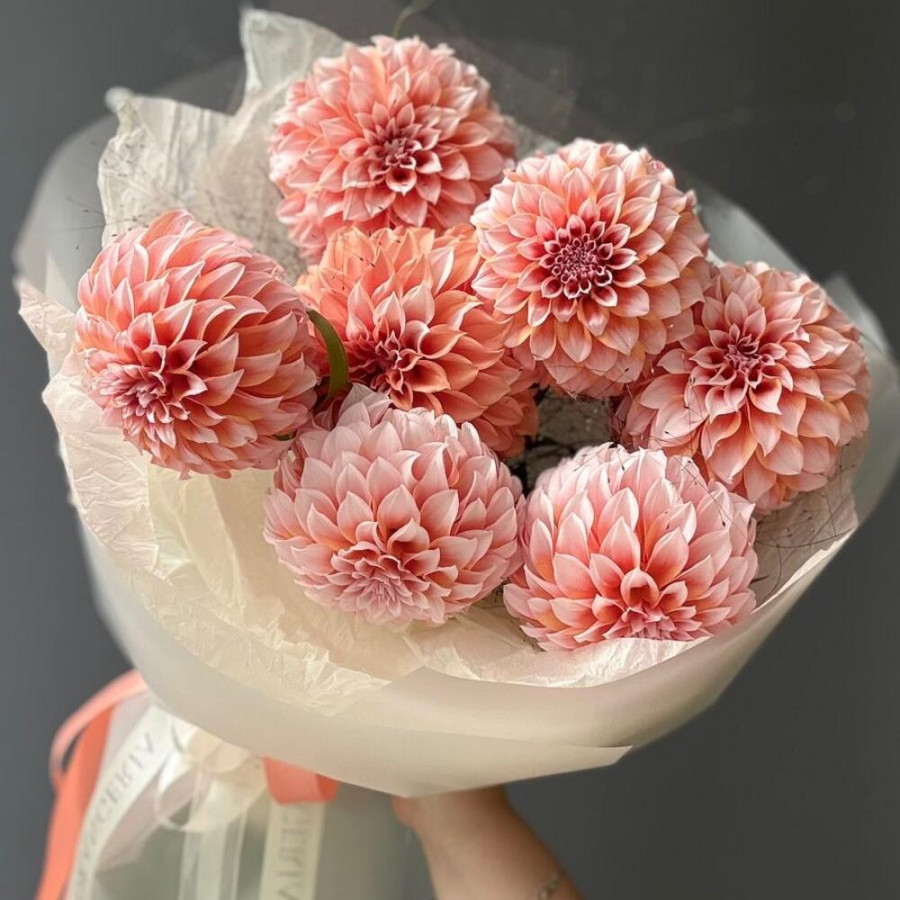 На фото букет из 7 персиковых георгин. В составе: георгина 7 шт, зелень 3 шт, дизайнерская упаковка 1 шт, атласная лента 1 шт, . Все цветы свежие и ароматные, букет красиво оформлен и отлично подходит для подарка. Доступна доставка цветов или самовывоз.