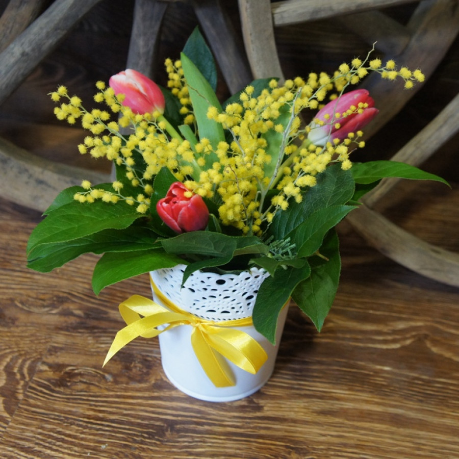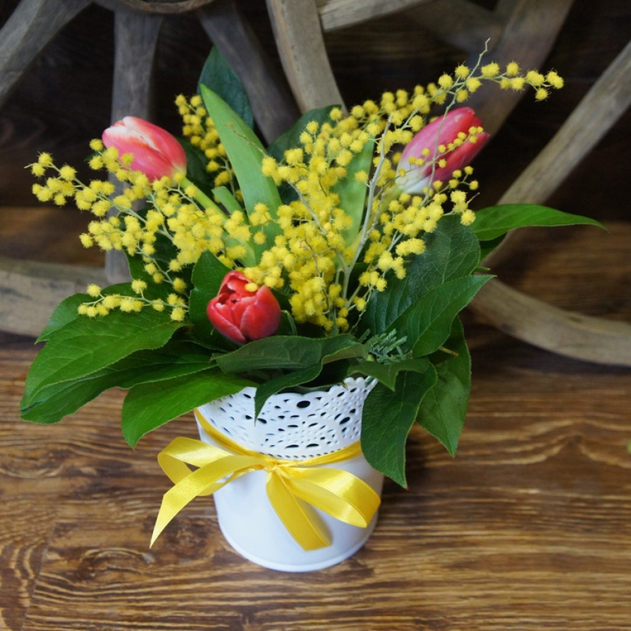 Заказывая данную композицию, Вы можете быть уверены – сердце Вашей избранницы будет покорено. Довольно простой, но выполненный с любовью дизайн, невероятно милая и яркая мимоза, нежнейшие тюльпаны и декоративные листочки салала обязательно затронут самые глубокие нотки женской души. Мягкий, свежий аромат наполнит комнату, и на протяжении долгого времени будет напоминать о том, кто сделал такой оригинальный сюрприз.