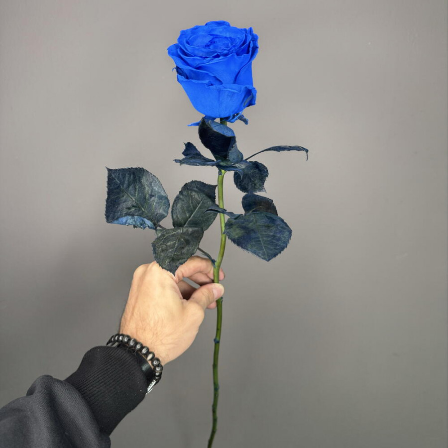 На фото синяя роза 1 штука. В составе: роза (синяя) 1 шт, . Все цветы свежие и ароматные, букет красиво оформлен и отлично подходит для подарка. Доступна доставка цветов или самовывоз.